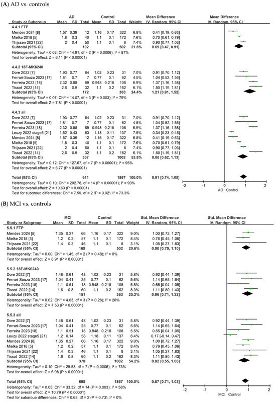 As shown in Figure 5B, the meta-analysis focused on the comparisons between patients with MCI and controls. The heterogeneity test of the included studies indicated substantial heterogeneity for the matched plasma–PET biomarker pairs (p-tau181 with 18F-flortaucipir: χ2 = 1.49, p = 0.69, I2 = 0; p-tau181 with 18F-MK6240: χ2 = 11.42, p = 0.003, I2 = 82%; p-tau217 with 18F-flortaucipir: χ2 = 0.12, p = 0.73, I2 = 0; p-tau217 with 18F-MK6240: χ2 = 3.54, p = 0.17, I2 = 43%; p-tau231 with 18F-MK6240: χ2 = 0.06, p = 0.81, I2 = 0). To adopt a conservative approach in synthesizing evidence from the small number of observational studies, random-effects models were applied across all analyses. This yielded combined SMDs of 0.33 (95% CI = [0.17, 0.50], Z = 3.95, p < 0.0001) for p-tau181 with 18F-flortaucipir, 0.92 (95% CI = [0.37, 1.46], Z = 3.29, p = 0.001) for p-tau181 with 18F-MK6240, 0.58 (95% CI = [0.35, 0.81], Z = 4.96, p < 0.00001) for p-tau217 with 18F-flortaucipir, 1.22 (95% CI = [0.90, 1.54], Z = 7.49, p < 0.00001) for p-tau217 with 18F-MK6240, and 0.29 (95% CI = [0.03, 0.54], Z = 2.19, p = 0.03) for p-tau231 with 18F-MK6240. In all cases, the differences were statistically significant, with tau PET SUVR values showing significant associations with the corresponding plasma tau isoforms in patients with MCI compared to controls.