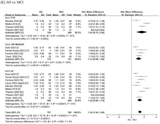 As shown in Figure 4C, the meta-analysis focused on comparisons between patients with AD and those with MCI. The heterogeneity test of the included studies indicated substantial heterogeneity for tau PET biomarkers (18F-flortaucipir: χ2 = 15.83, p = 0.0004, I2 = 87%; 18F-MK6240: χ2 = 8.17, p = 0.04, I2 = 63%; overall: χ2 = 37.07, p < 0.00001, I2 = 81%). Random-effects models were therefore applied to pool the effect sizes, yielding combined SMDs of 1.63 (95% CI = [0.75, 2.50], Z = 3.64, p = 0.00003) for 18F-flortaucipir, 1.14 (95% CI = [0.69, 1.58], Z = 4.99, p < 0.00001) for 18F-MK6240 and 1.32 (95% CI = [0.90, 1.73], Z = 6.27, p < 0.00001) for the overall pooled analysis. In all cases, the differences were statistically significant, with tau PET SUVR values being elevated in AD compared to MCI.