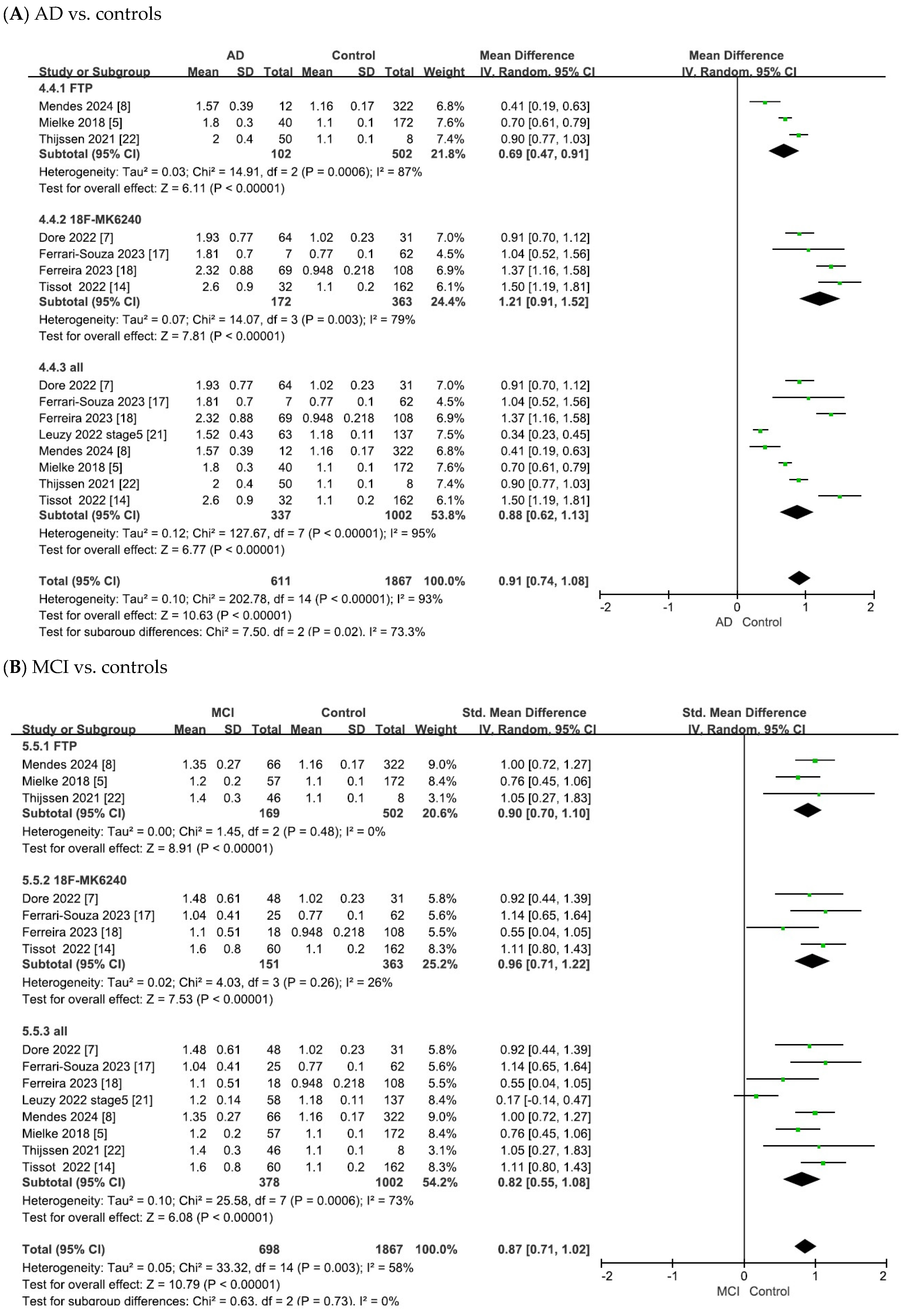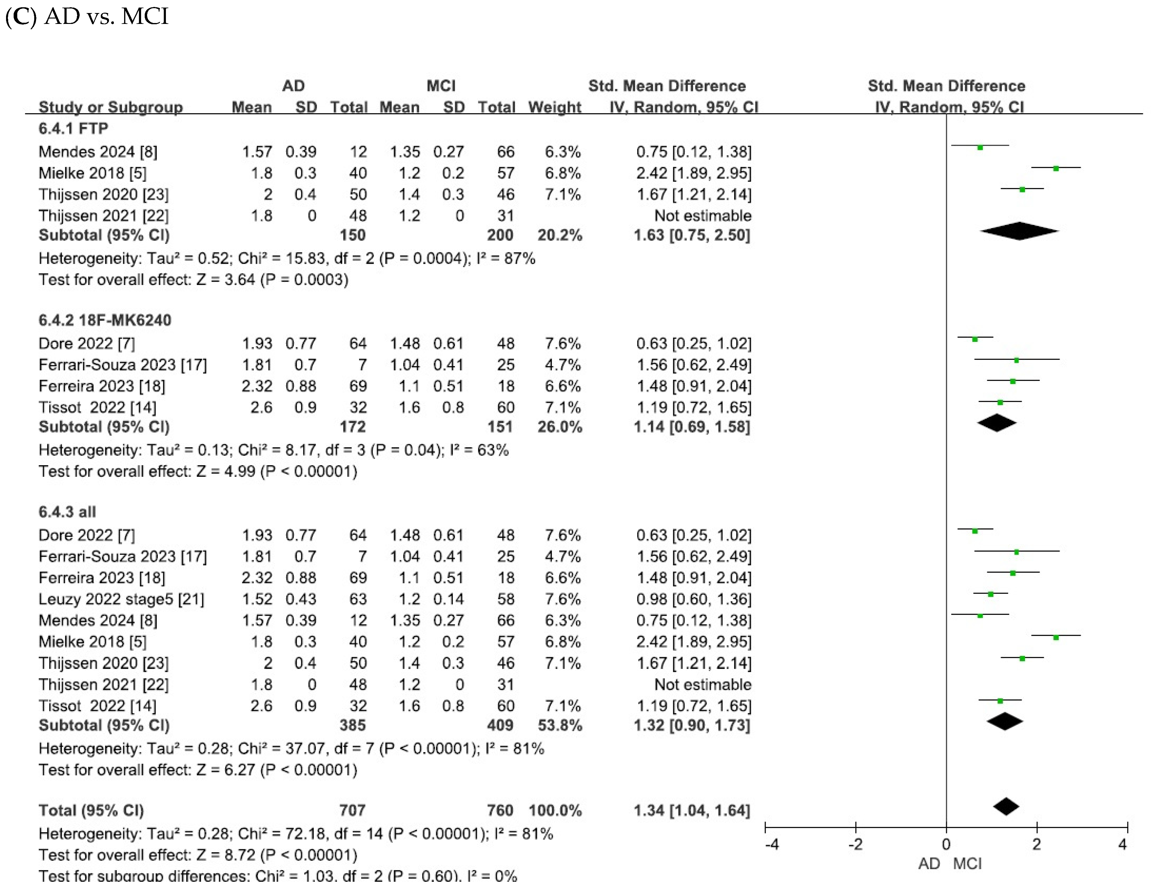 3.5. Meta-Analysis of Tau PET Biomarkers
