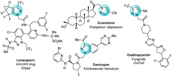 Approved pyrazole-based drugs and agrochemicals synthesized by N-alkylation of heterocyclic core.