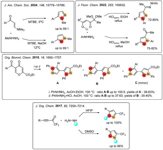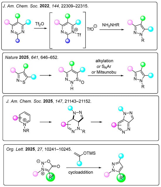 To obtain exclusively one regioisomeric pyrazole it is offered the transformations of five- or six-membered heterocycles (e.g., pyrimidines, sydnones, and thiazoles) based on skeletal editing (Figure 3) [,,,].