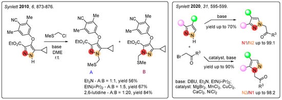 N-Alkylation of unsymmetric pyrazoles typically yields a mixture of regioisomers. Regioselectivity of this reaction can be controlled by the nature of the bases used or by changing the size and charge of the cation (Figure 4) [,].