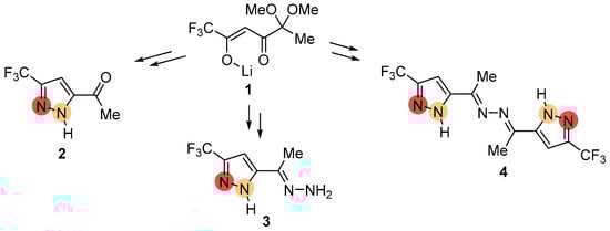 Recently we have developed the synthesis of unsymmetric pyrazoles with different functional groups, based on the condensation of hydrazines with 1,2,4-triketones and their analogs [,,,]. In particular, acetyl- and hydrazone-substituted CF3-pyrazoles 2–4 are a flexible platform for derivatization (Figure 5).