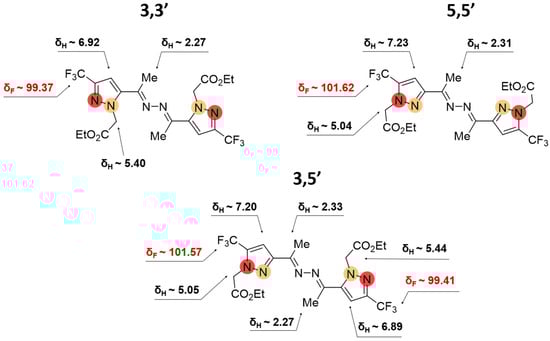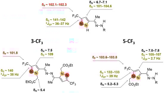The structural differentiation of 3-CF3- and 5-CF3-substituted pyrazoles was readily achieved by analysis of 19F NMR spectra [] (Figure 6 and Figure 7). Compared with NH-pyrazoles, the signal of the trifluoromethyl group of 5-CF3-pyrazoles was shifted downfield when substitution occurred at the adjacent nitrogen atom, whereas for 3-CF3-substituted derivatives, it appeared upfield in both DMSO-d6 and CDCl3 solutions. According to 13C NMR data, the characteristic signals of the CCF3- and CH groups were observed at different δC ranges and exhibited distinct JCF coupling constants, enabling unambiguous isomer identification (Figure 6). As for the proton signals, in the case of alkylated ketazine products, the differences were most evident in CDCl3 solutions (Figure 7).