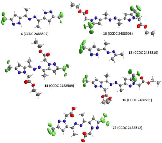The crystal structures of (bis)pyrazoles 4, 13–16, and 25 were confirmed by XRD data (Figure 8, Table S1). All these products have substituents located in the trans position relative to the diazo fragment, as expected. In most pyrazoles, the azine fragment and the azole rings were coplanar. However, in product 15, the two imine groups lay in different planes and formed a dihedral angle of ~74° (see Figure S43). The orientation of the azole rings depended on the substituent position at the nitrogen atom of pyrazole. 3-CF3-Regioisomers had a common N,N-cavity involving the nitrogen atoms of the azole and hydrazone moieties, while the orientation of the azole rings and the hydrazone group in 5-CF3-pyrazole 13 prevented the formation of a single cavity. The structural patterns described for regioisomeric products also apply to the unsymmetric ketazine 16. Crystal packings of pyrazoles 4, 13–16, and 25 are shown in Supporting Information (Figures S44–S49).