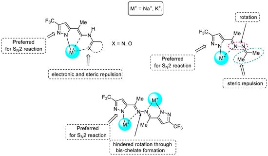 For acetylpyrazole 2, alkylation at the NH group was low-selective (Scheme 2). However, conversion of the acetyl group into a hydrazone moiety enhances the regioselectivity in some cases. The functionalization of the hydrazone fragment is crucial for the synthesis of N-substituted 5-CF3-pyrazoles. We propose that the functional group is coordinated with alkali metal ions of in situ-generated pyrazolates (Figure 9). The formation of a single chelate cavity sterically hinders one of the pyrazole N-atoms, preventing it from participating in a bimolecular nucleophilic substitution with ethyl iodoacetate. In the case of NH-ketazine 4 and pyrazole 15, such a coordination cavity does not appear to form; therefore, there are no steric hindrances for nucleophilic attack at the pyrazole nitrogen atom adjacent to the hydrazone fragment.