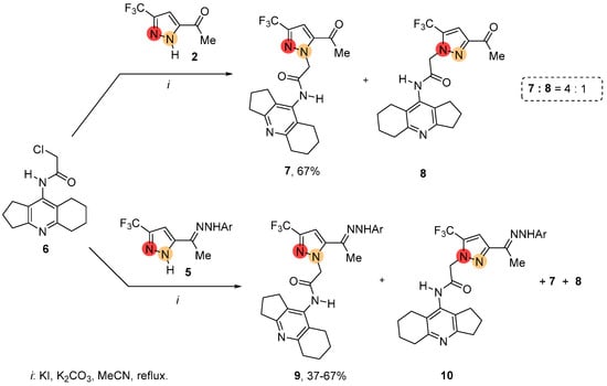To design the bioactive molecules, acetylpyrazole 2 and its derivatives 5 were alkylated with amiridine-based chloroacetamide 6 (Scheme 1) []. Under standard conditions, the N-alkylation of acetylpyrazole 2 in the presence of potassium carbonate in acetonitrile resulted in a mixture of two possible products, 7 and 8, with the prevalence of 3-CF3-regioisomer. A similar alkylation of acetylpyrazole derivatives 5 also proceeded with the formation of two possible regioisomers, 9 and 10. However, in this case the reaction was accompanied by side processes involving the transformations of hydrazone substituents.