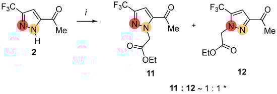 N-alkylation of acetyl-CF3-pyrazole 2. Reaction conditions: i: ICH2CO2Et, K2CO3, MeCN, reflux. * According to 19F NMR data of the reaction mixture (see Section 4.3.3, Figure S1).
