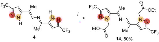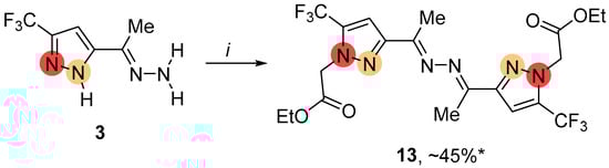 N-alkylation of hydrazine-substituted CF3-pyrazole 3. Reaction conditions: i: ICH2CO2Et, K2CO3, MeCN, reflux. * According to 19F NMR data of the reaction mixture (see Section 4.3.3, Figure S2).
