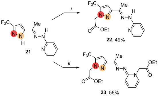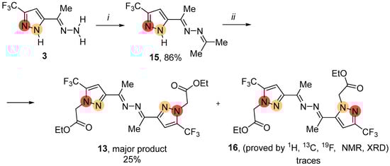 N-alkylation of hydrazine-substituted CF3-pyrazole. Reaction conditions: i: acetone, reflux; ii: ICH2CO2Et, K2CO3, MeCN, reflux.