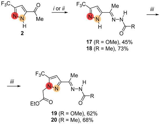 N-alkylation of CF3-pyrazoles with modified hydrazone groups. Reaction conditions: i: methyl carbazate, HClconc, MeOH, reflux; ii: acetohydrazide, AcOH, MeCN, reflux; iii: ICH2CO2Et, K2CO3, MeCN, reflux.