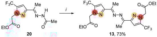 Next, we developed an efficient approach to the synthesis of regioisomeric 5,5′-bis-CF3-pyrazolylketazine 13 using the reaction of functionalized N-alkylated pyrazole 20 with hydrazine (Scheme 8). Pyrazole 20 reacted with hydrazine in ethanol under acid conditions to give the ketazine 13 in a high yield.