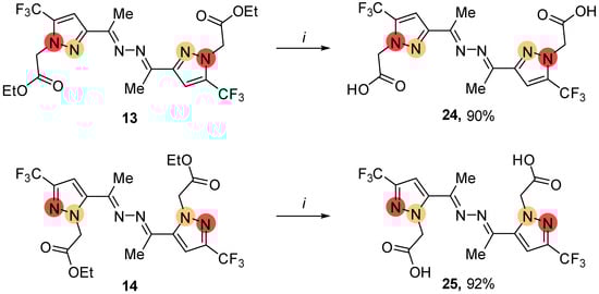 Considering the potential of carboxylate ligands for coordination chemistry, we successfully hydrolyzed the regioisomeric CO2Et-containing ketazines 13 and 14 into the corresponding bis-pyrazole carboxylates 24 and 25 under basic conditions (Scheme 9).