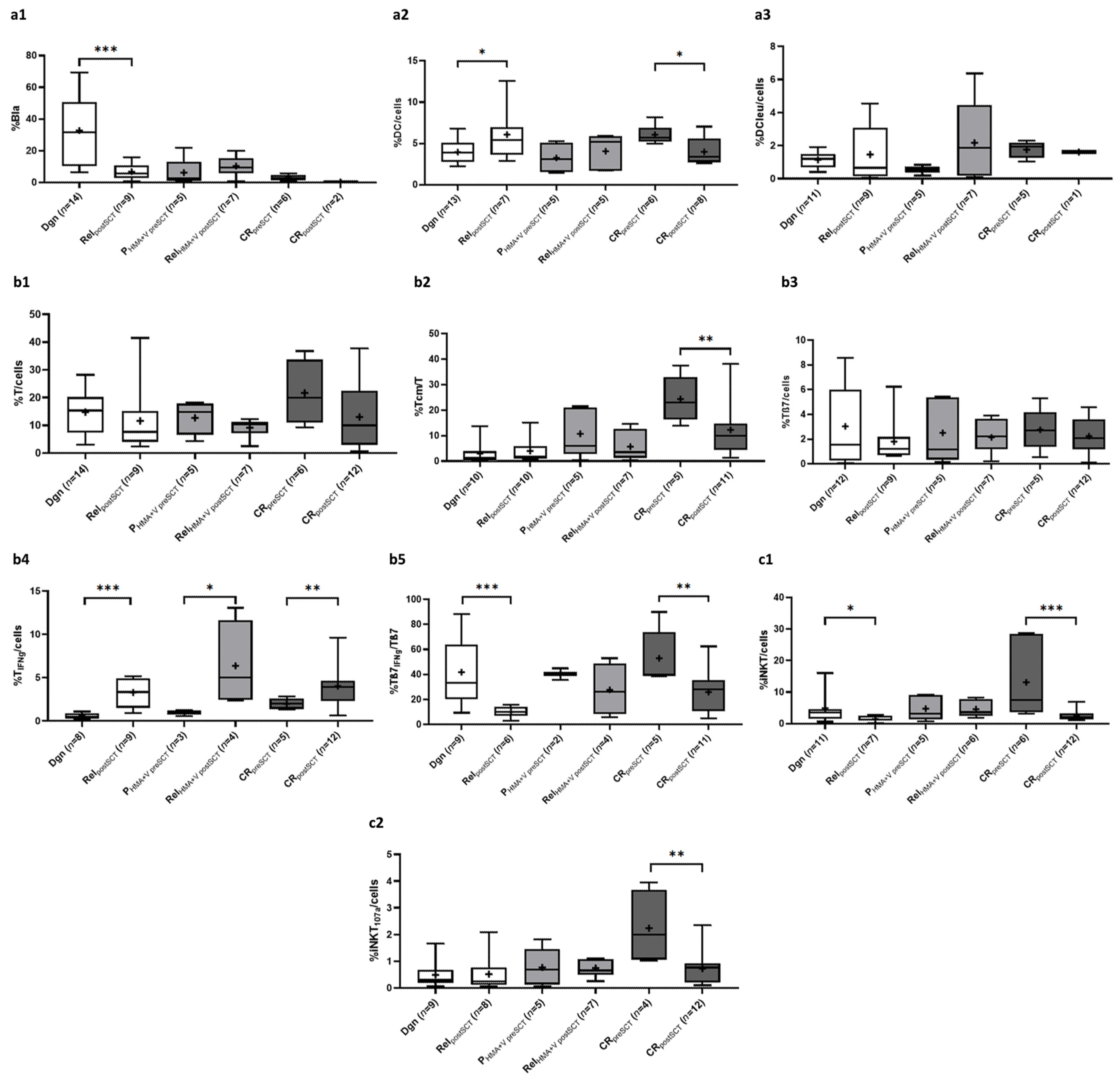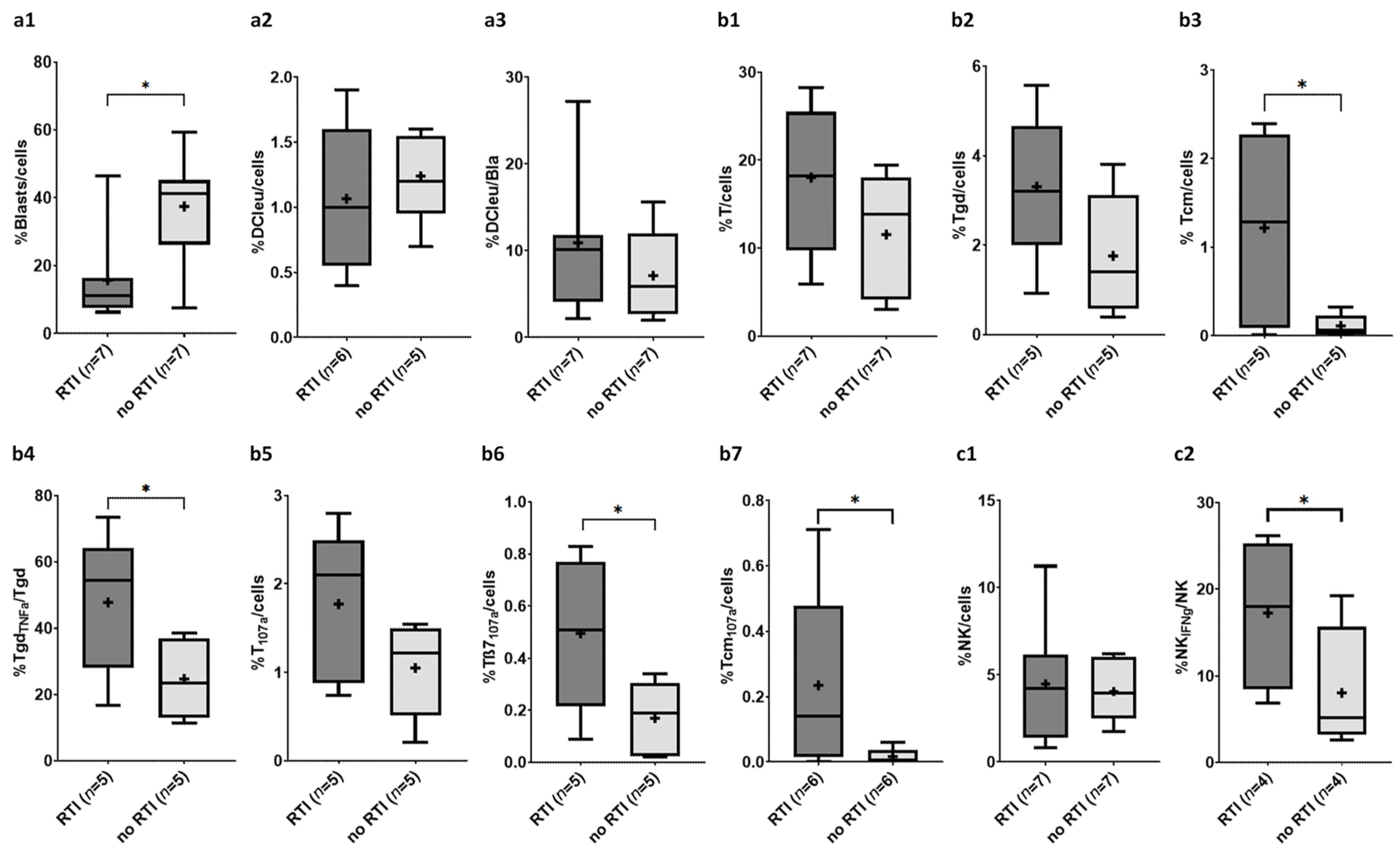 3.5. (Leukemia-Specific) Immune and Myeloid Cells in Correlation of Response to Induction (RTI) Therapy and in Patients Studied at First Dgn with Respect to Patients’ Median Survival