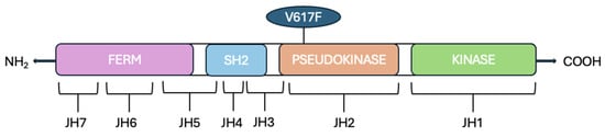 The Jak2 gene is located on chromosome 9p24.1 that encodes a non-receptor tyrosine kinase. The Jak2 gene comprises 142,939 base pairs (bp) and contains the following components: a promoter region, 25 exons, 25 introns, and a terminator region [25]. Alternative splicing produces three isoforms of the JAK2 protein, generating seven transcripts ranging from 6900 to 7000 bp [25]. In mammals, there are four members of the JAKs protein family: JAK1, JAK2, JAK3, and Tyrosine Kinase 2 (TYK2). JAKs proteins are composed of an N-terminal FERM (four-point-one, ezrin, radixin, moesin) domain, an Src Homology 2 (SH2) domain, a kinase-like pseudokinase domain (JH2) and a C-terminal tyrosine kinase domain JH1 [26] (Figure 1).