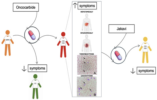Figure 4. Schematic representation of 46/1 haplotype correlation with symptoms related to onco-drug resistance onset in MPN patients: Patient diagnosed for MPN (in orange) undergoes treatment with Oncocarbide as first-line therapy. CC haplotype (in green) correlates with good disease outcome, with improvement of symptoms (downward arrow). Otherwise, CG or GG conditions (in red) are more often associated with patients’ worsening, leading to the onset of the symptoms (upperward arrow) related with the onco-drug resistance, such as hepatomegaly, splenomegaly, thrombocytosis and leukocytosis. In the last case, ruxolitinib is used as second-line therapy (in yellow) for the improvement of symptoms (downward arrow). Microscopic images of thrombocytosis and leukocytosis were acquired using a 100× oil immersion objective. Black arrows show platelets in A and leucocytes in B.