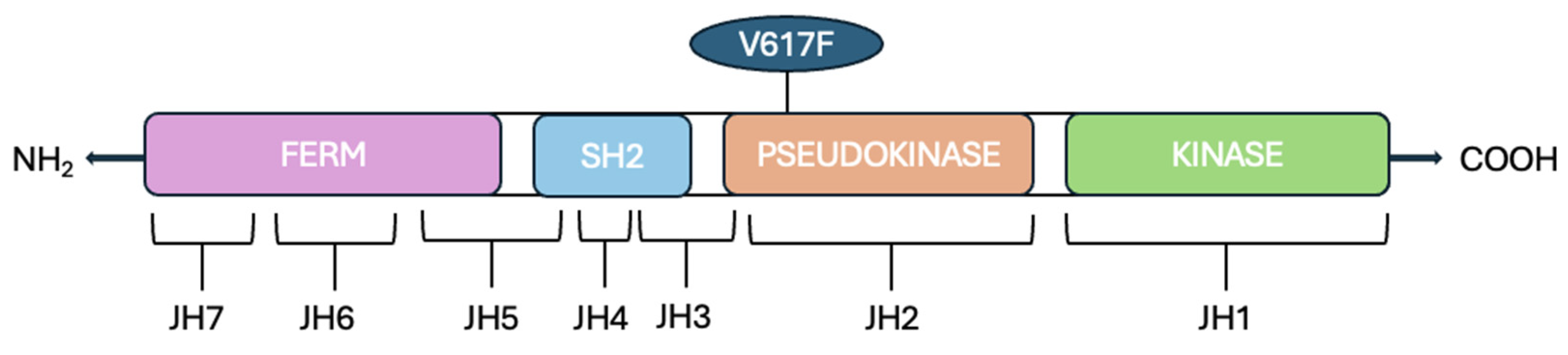 - Zhang, Y.; Zhao, Y.; Liu, Y.; Zhang, M.; Zhang, J. New advances in the role of JAK2 V617F mutation in myeloproliferative neoplasms. Cancer 2024, 130, 4229–4240. [Google Scholar] [CrossRef]