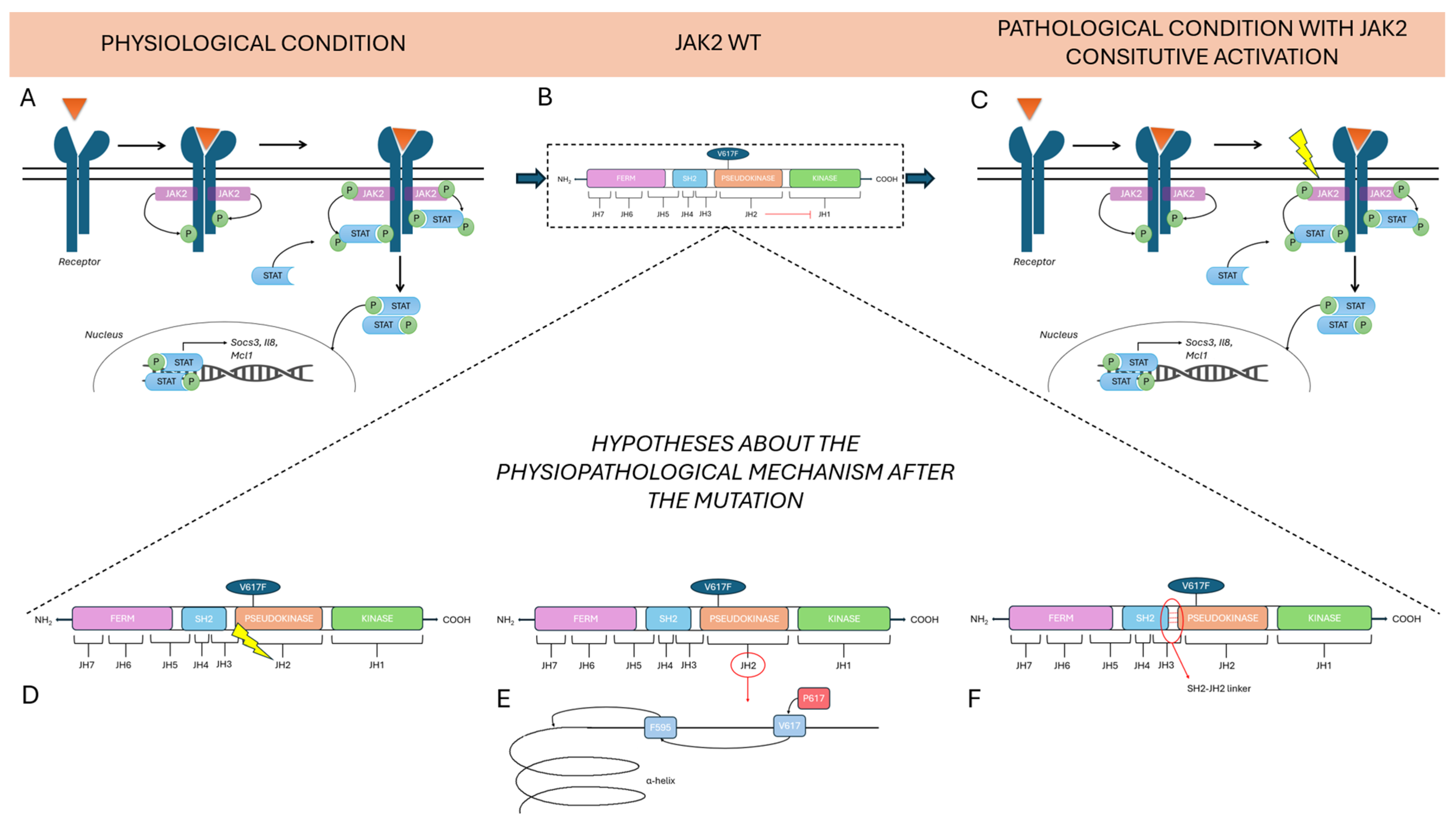 - Abraham, B.G.; Haikarainen, T.; Vuorio, J.; Girych, M.; Virtanen, A.T.; Kurttila, A.; Karathanasis, C.; Heilemann, M.; Sharma, V.; Vattulainen, I.; et al. Molecular basis of JAK2 activation in erythropoietin receptor and pathogenic JAK2 signaling. Sci. Adv. 2024, 10, eadl2097. [Google Scholar] [CrossRef] [PubMed]