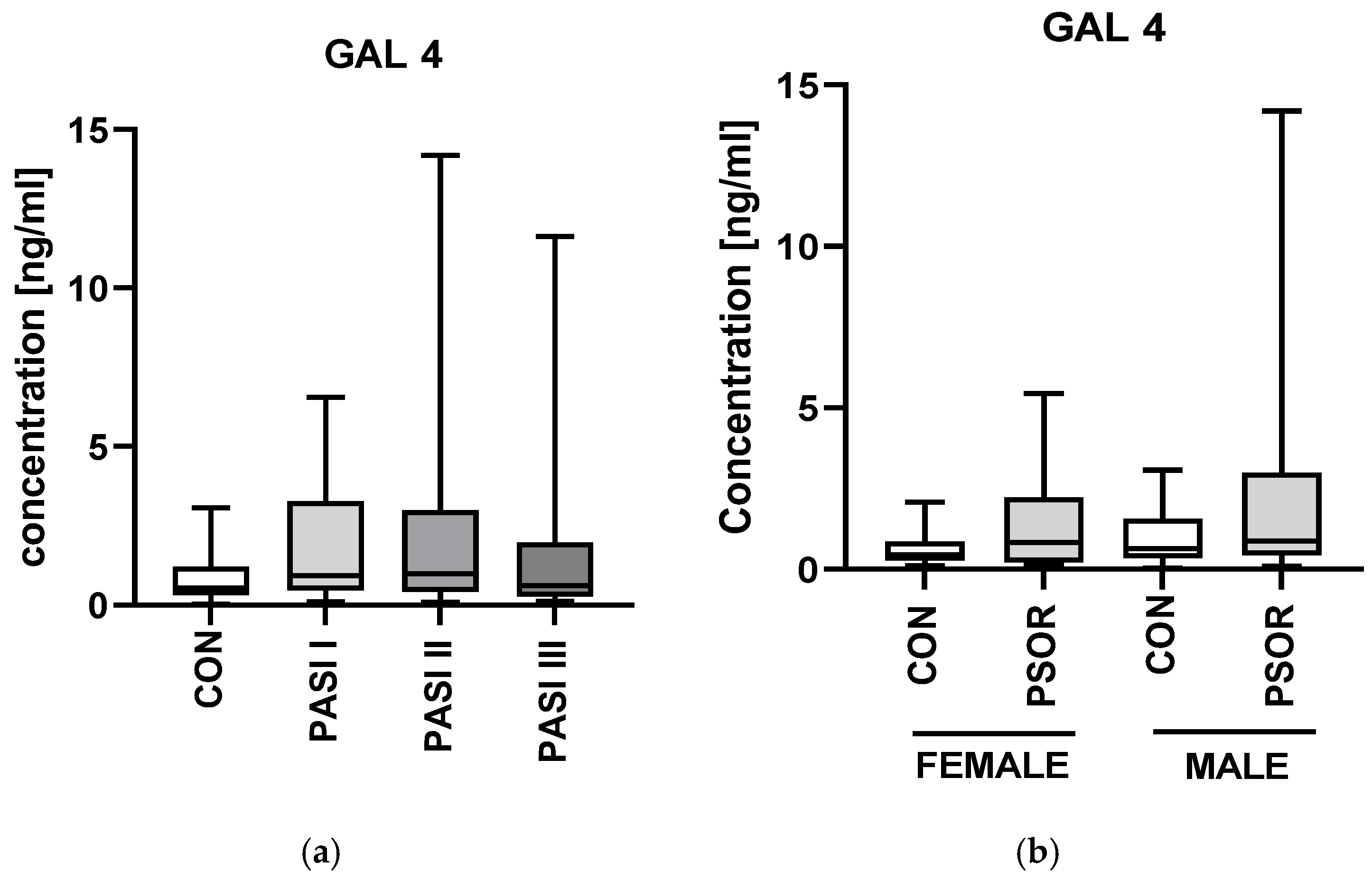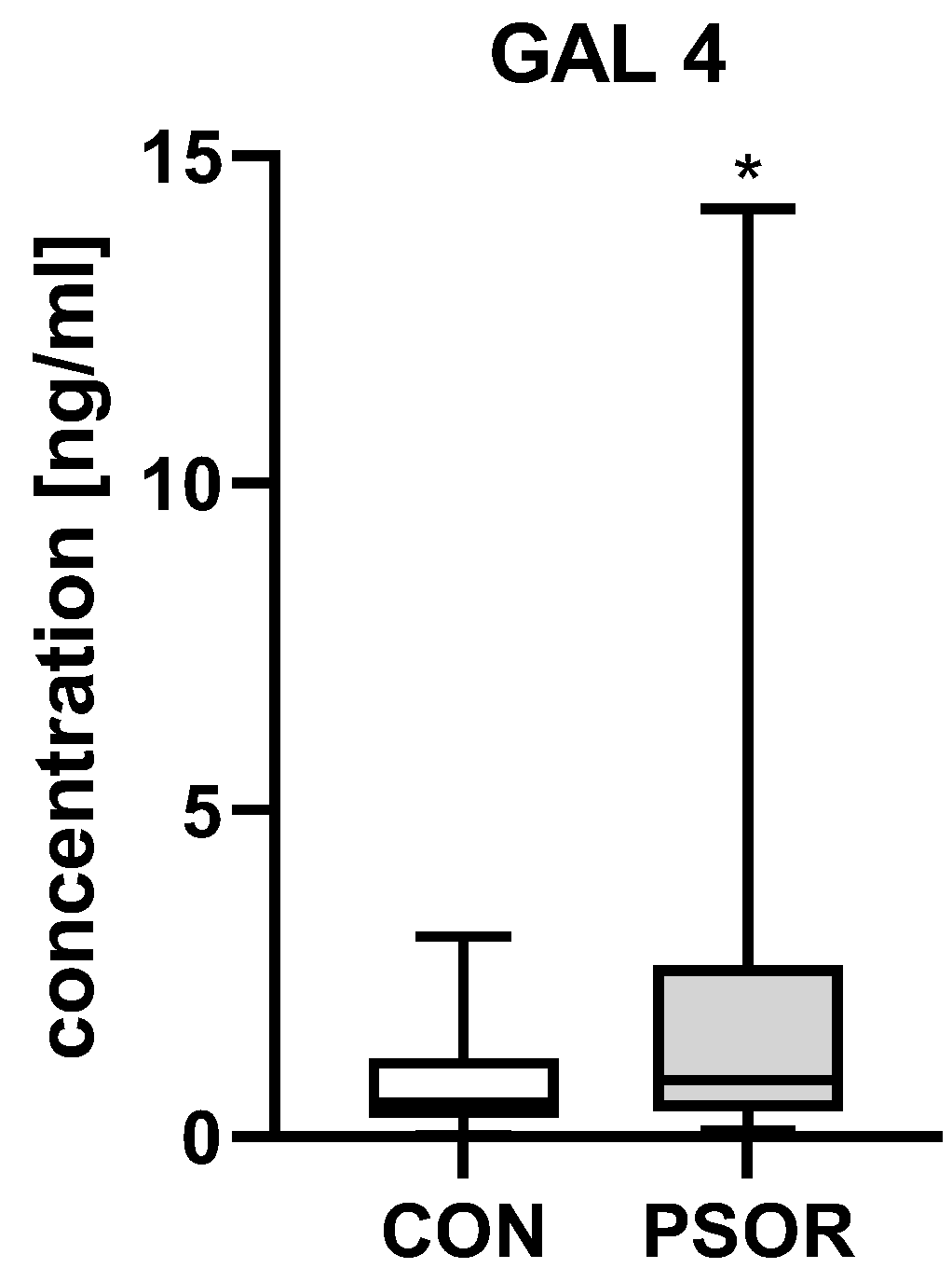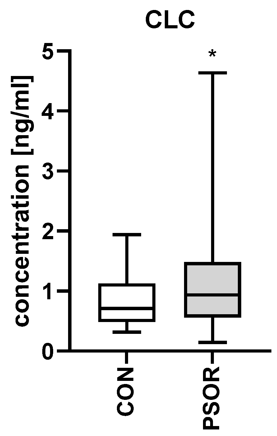 - Nowowiejska, J.; Baran, A.; Hermanowicz, J.M.; Sieklucka, B.; Pawlak, D.; Flisiak, I. Evaluation of Plasma Concentrations of Galectins-1, 2, and 12 in Psoriasis and Their Clinical Implications. Biomolecules 2023, 13, 1472. [Google Scholar] [CrossRef] [PubMed]