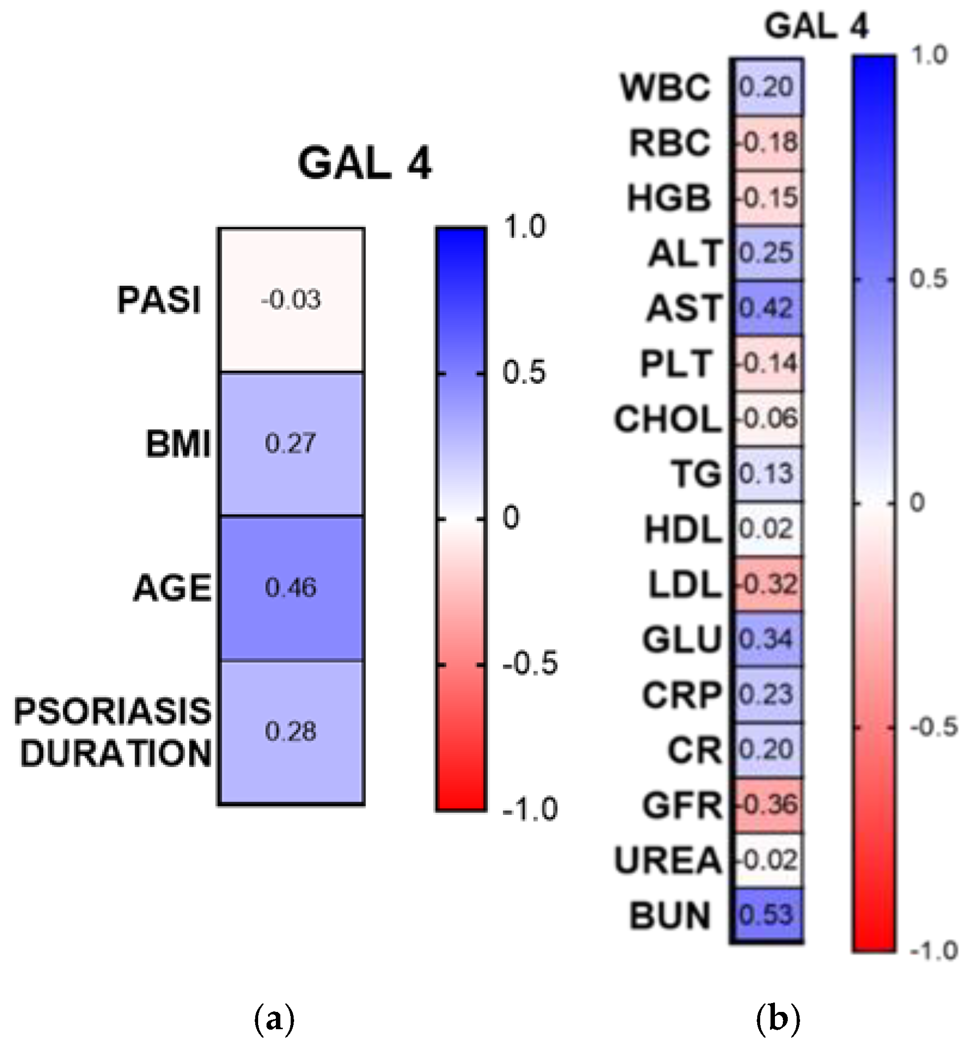 Chicago/Turabian StyleBaran, Anna, Julia Nowowiejska, Julia Parzych, Justyna Magdalena Hermanowicz, Beata Sieklucka, Dariusz Pawlak, and Iwona Flisiak. 2025. "Plasma Galectin-4 and Charcot-Leyden Crystal Protein/Galectin-10 as Emerging Biomarkers of Metabolically Induced Inflammation in Patients with Psoriasis" International Journal of Molecular Sciences 26, no. 21: 10339. https://doi.org/10.3390/ijms262110339