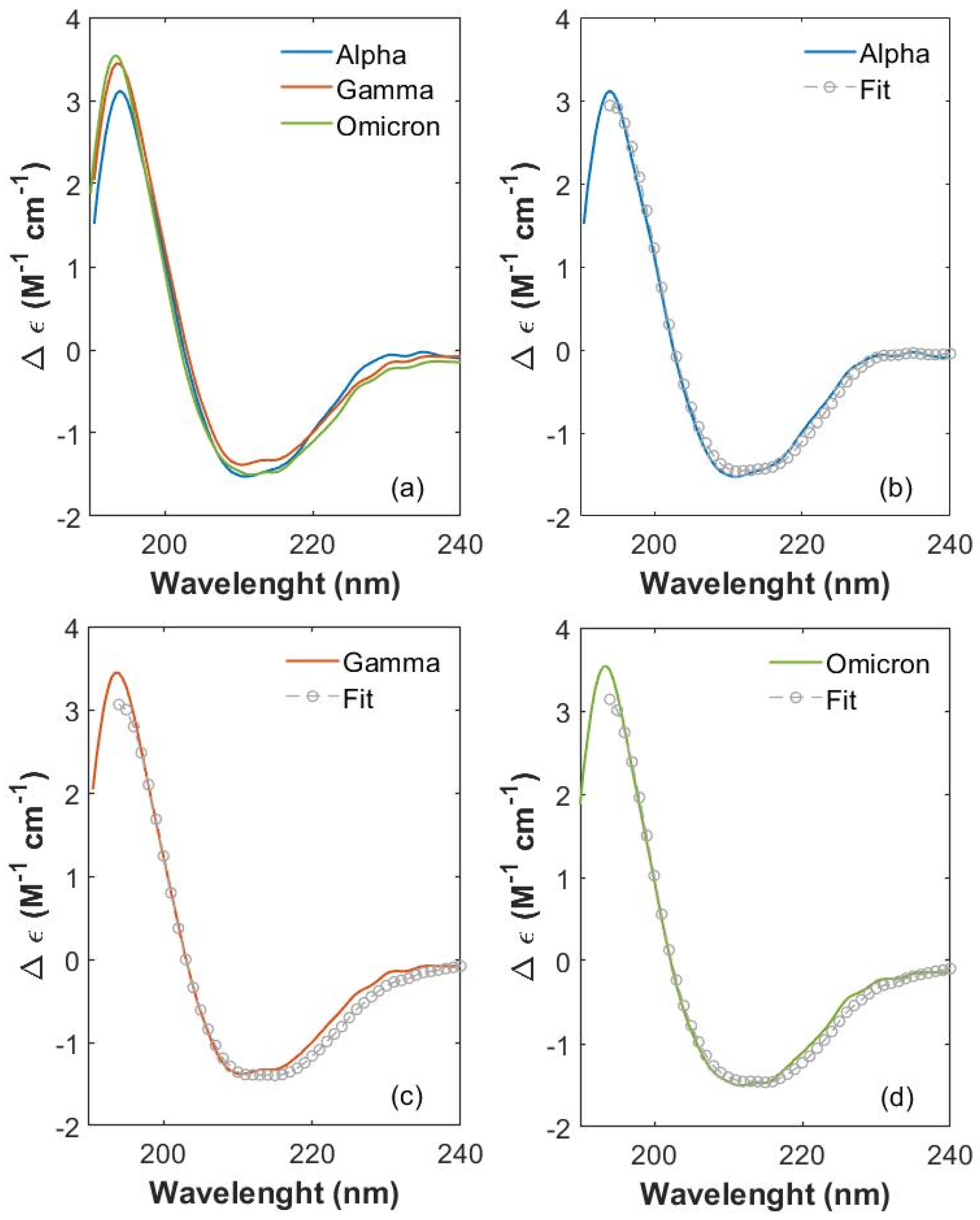 - Mosetti, R.; Mancini, T.; Bertelà, F.; Macis, S.; Luchetti, N.; Minicozzi, V.; Lupi, S.; D’aRco, A. Spectroscopic secondary structure fingerprint of β-variant of SARS-CoV-2 spike glycoprotein. Eur. Biophys. J. 2025. [Google Scholar] [CrossRef] [PubMed]
