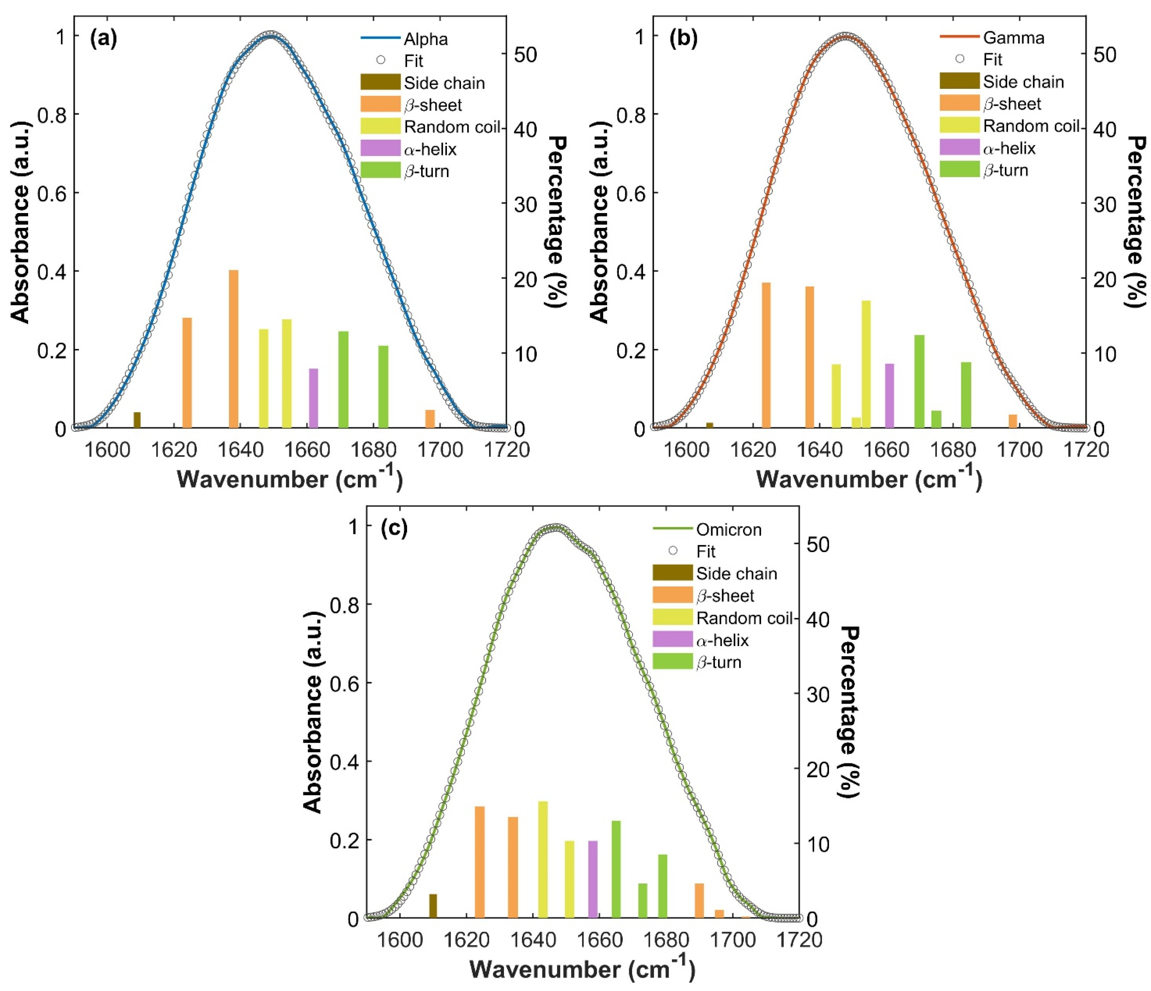 - D’Arco, A.; Di Fabrizio, M.; Mancini, T.; Mosetti, R.; Macis, S.; Tranfo, G.; Della Ventura, G.D.; Marcelli, A.; Petrarca, M.; Lupi, S. Secondary Structures of MERS-CoV, SARS-CoV, and SARS-CoV-2 Spike Proteins Revealed by Infrared Vibrational Spectroscopy. Int. J. Mol. Sci. 2023, 24, 9550. [Google Scholar] [CrossRef]