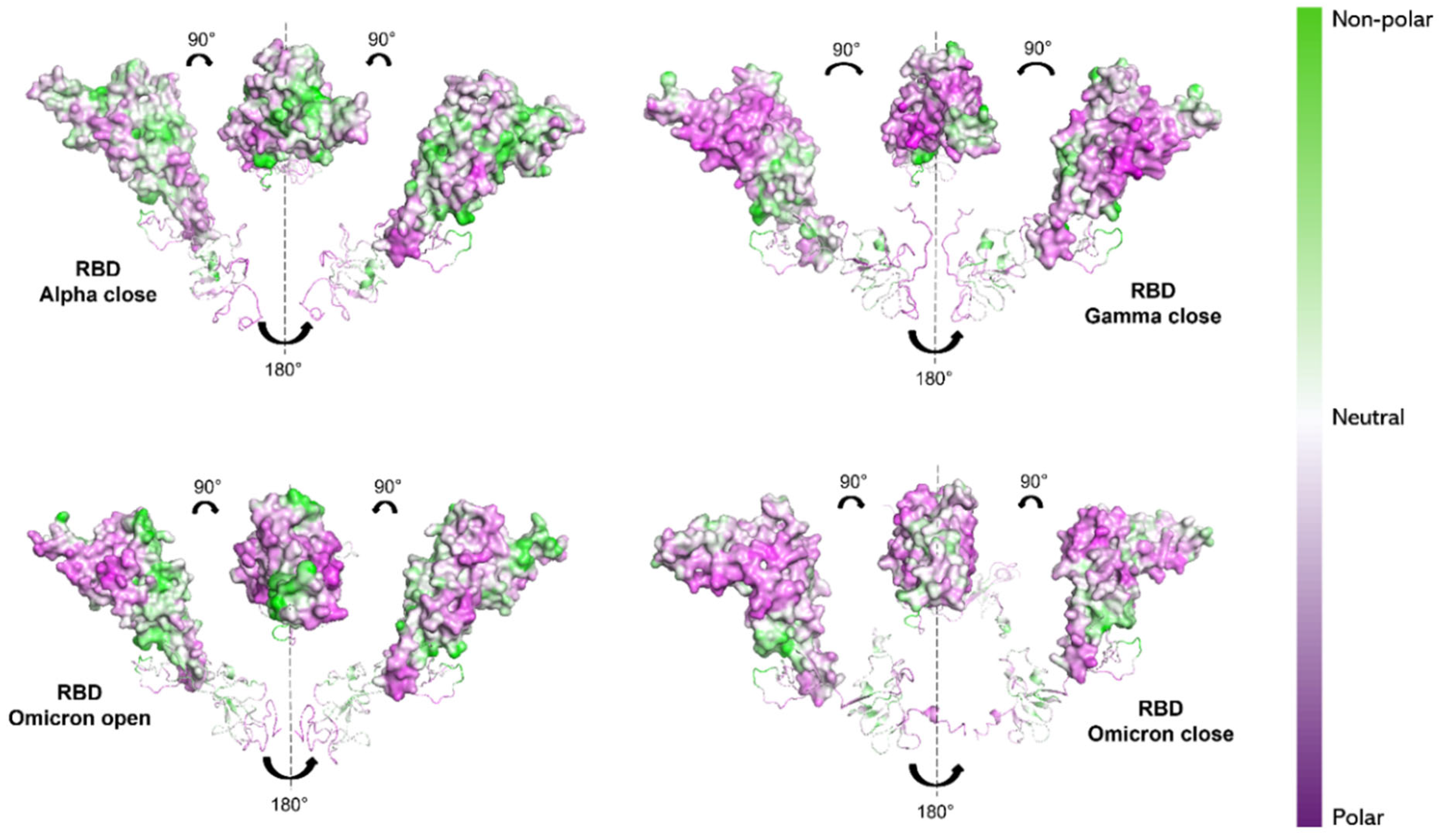 - Singh, J.; Vashishtha, S.; Rahman, S.A.; Ehtesham, N.Z.; Alam, A.; Kundu, B.; Dobrindt, U. Energetics of Spike Protein Opening of SARS-CoV-1 and SARS-CoV-2 and Its Variants of Concern: Implications in Host Receptor Scanning and Transmission. Biochemistry 2022, 61, 2188–2219. [Google Scholar] [CrossRef]