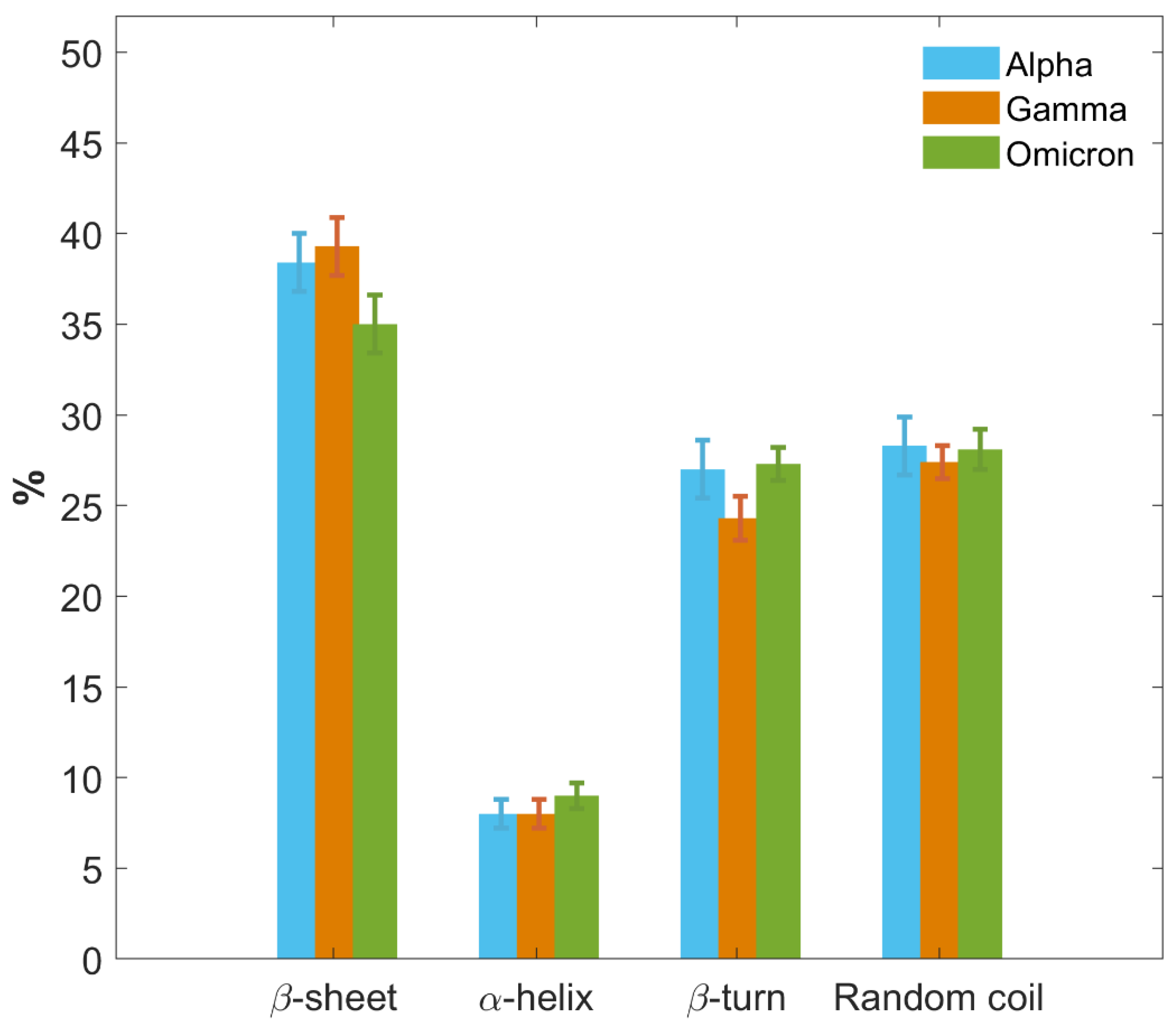 | Variants | β-Sheets (%) | α-Helix (%) | β-Turn (%) | Random Coil (%) |