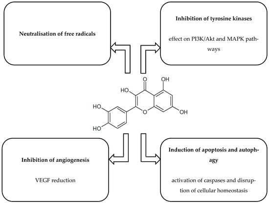 QCT has also been the subject of numerous studies and is of interest as a compound with antioxidant, anti-inflammatory, and anticancer properties. In recent years, several preclinical studies have demonstrated its ability to modulate cellular pathways associated with apoptosis, proliferation, angiogenesis, and immune responses. A study by Roy et al. (2018) reported that a vanadium complex with QCT significantly reduced hyperplastic changes in female Sprague–Dawley rats, increasing the apoptosis index and decreasing the expression of pro-apoptotic markers (Bax, p53), while elevating the level of Bcl-2. A reduction in tumour cell proliferation was also observed (11.3 ± 0.12; 11.8 ± 0.10) []. Luo et al. (2024) further demonstrated that QCT alleviated depressive symptoms in mice exposed to chronic stress while simultaneously limiting breast tumour development under stressful conditions. The mechanism of action involved decreased STAT1 expression in microglia and reduced sympathetic activity within the tumour. The use of a colony-stimulating factor 1 receptor inhibitor confirmed the key role of microglia in this process [].