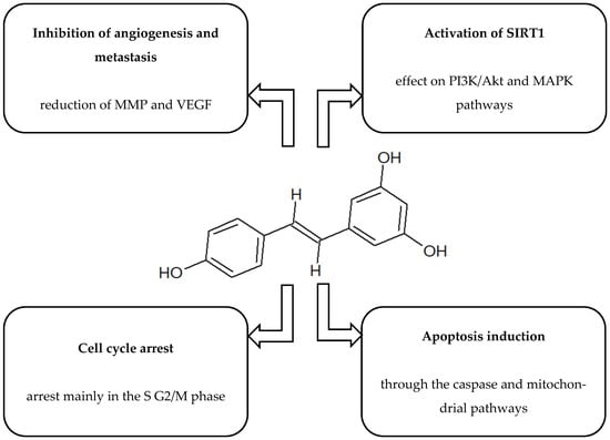 - Ko, J.H.; Sethi, G.; Um, J.Y.; Shanmugam, M.K.; Arfuso, F.; Kumar, A.P.; Bishayee, A.; Ahn, K.S. The Role of Resveratrol in Cancer Therapy. Int. J. Mol. Sci. 2017, 18, 2589. [Google Scholar] [CrossRef] [PubMed]