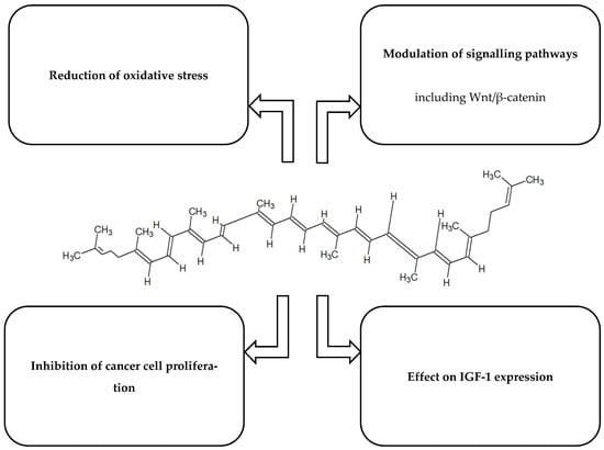 The natural carotenoid LycT displays a wide range of biological properties, including antioxidant and anti-inflammatory effects, and has therefore been the subject of numerous preclinical studies. In a model of N-nitrosodiethylamine (NDEA)-induced hepatocellular carcinoma, LycT supplementation effectively reduced tumour cell proliferation and metabolic disorders in liver tissue. Treatment stabilised the expression of genes related to the cell cycle (proliferating cell nuclear antigen, cyclin D1, and p21) reduced the activity of glycolytic enzymes and HIF-1α, and increased the number of apoptotic cells and macrophages, indicating a multidirectional mechanism of action [].