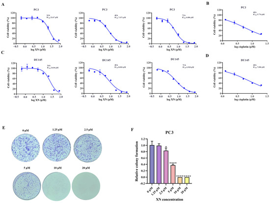 XN exhibits anti-proliferative activity against prostate cancer cells (A) The cytotoxicity of XN against PC3 cells. Viability of PC3 cells following 24, 48, and 72 h of XN treatment, assessed by SRB assay. (B) PC3 cells were exposed to cisplatin for 48 h and the cell viability was determined by SRB assay. (C) The cytotoxicity of XN against DU145 cells. Viability of DU145 cells following 24, 48, and 72 h of XN treatment, assessed by SRB assay. (D) DU145 cells were exposed to cisplatin for 48 h and the cell viability was determined by SRB assay. (E,F) Colony formation capacity of PC3 cells treated with 0, 1.25, 2.5, 5, 10 and 20 μM XN. Data are shown as mean ± SD. (* p < 0.05 and **** p < 0.0001 relative to control conditions).