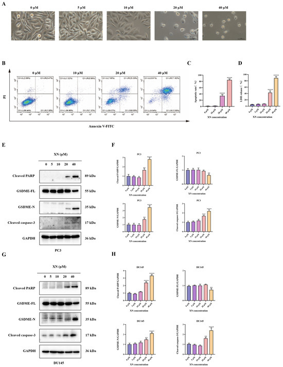 XN triggers pyroptosis in prostate cancer cells via GSDME. (A) Concentration-dependent morphological alterations in PC3 cells exposed to XN for 48 h (microscopic observation). (B,C) Flow cytometric evaluation of apoptosis in PC3 cells treated with XN for 48 h using Annexin V-FITC/PI double staining. (D) After treating PC3 cells with 0, 5 10, 20, and 40 μM XN for 48 h, measure the LDH release. (E,F) Protein expression levels of cleaved caspase-3, PARP, GSDME-FL and GSDME-N in PC3 cells following XN treatment at different concentrations. (G,H) Protein expression levels of cleaved caspase-3, PARP, GSDME-FL and GSDME-N in DU145 cells following XN treatment at different concentrations. The bar chart represents the relative protein expression levels. Data are shown as mean ± SD. (** p < 0.01, *** p < 0.001 and **** p < 0.0001 relative to control conditions).