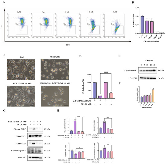 XN induces GSDME-dependent pyroptosis by activating the mitochondrial intrinsic apoptosis pathway. (A,B) PC3 cells were exposed to XN for 48 h and the MMP was determined by flow cytometry using JC-1 dyeusing. (C) Morphological changes in PC3 cells induced by XN for 48 h, either administered alone or in combination with Z-DEVD-fmk. (D) Cell viability of PC3 cells after treatment with XN alone or in combination with Z-DEVD-fmk for 48 h. (E,F) Cytochrome c expression levels was determined by Western blotting in PC3 cells under XN treatment at varying concentrations. (G,H) Expression of caspase-3, PARP, GSDME-FL and GSDME-N in PC3 cells after co-treatment with XN and Z-DEVD-fmk. The bar chart represents the relative protein expression levels. Data are shown as mean ± SD. (* p < 0.05, *** p < 0.001 and **** p < 0.0001 relative to control conditions; ## p < 0.01, ### p < 0.001 and #### p < 0.0001 indicate significant differences between experimental groups).