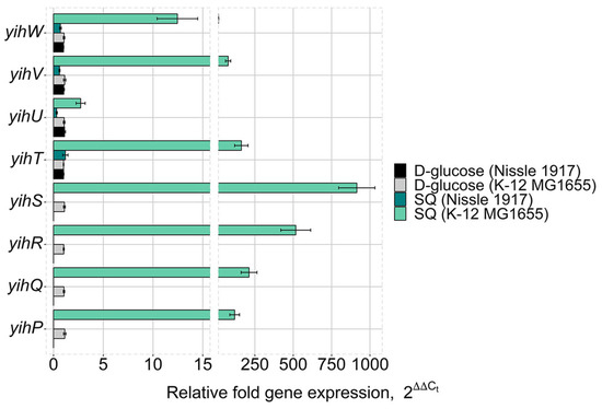 - Shimada, T.; Yamamoto, K.; Nakano, M.; Watanabe, H.; Schleheck, D.; Ishihama, A. Regulatory Role of CsqR (YihW) in Transcription of the Genes for Catabolism of the Anionic Sugar Sulfoquinovose (SQ) in Escherichia coli K-12. Microbiology 2019, 165, 78–89. [Google Scholar] [CrossRef]