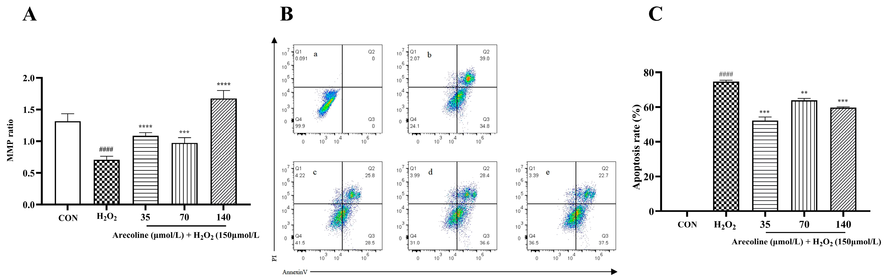 2.4. Effects of Arecoline on MMP and Apoptosis in H2O2-Induced SH-SY5Y Cells