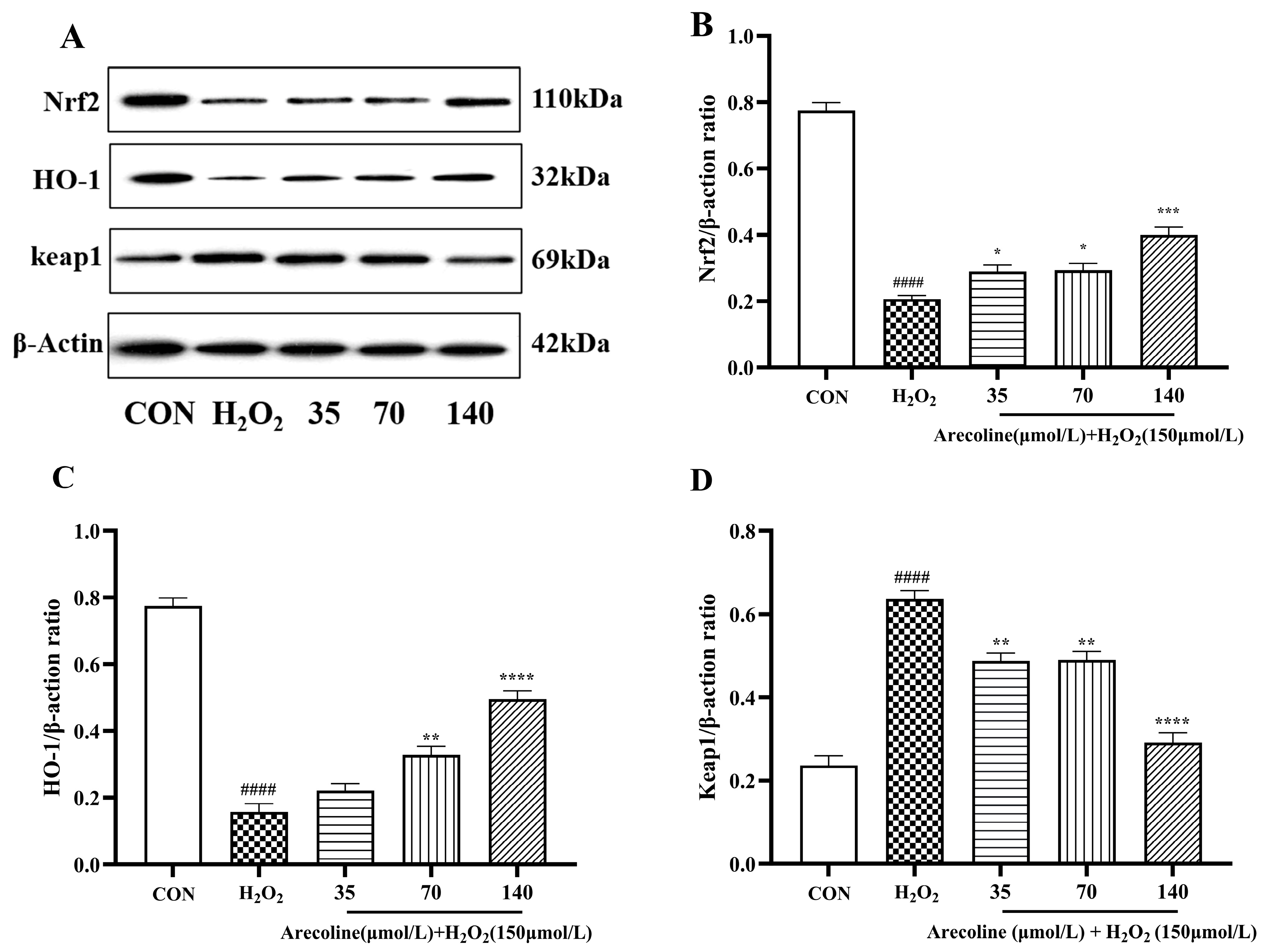 2.5. Effects of Arecoline on Nrf2/HO-1/Keap1 Signaling Pathways in H2O2-Induced SH-SY5Y Cells