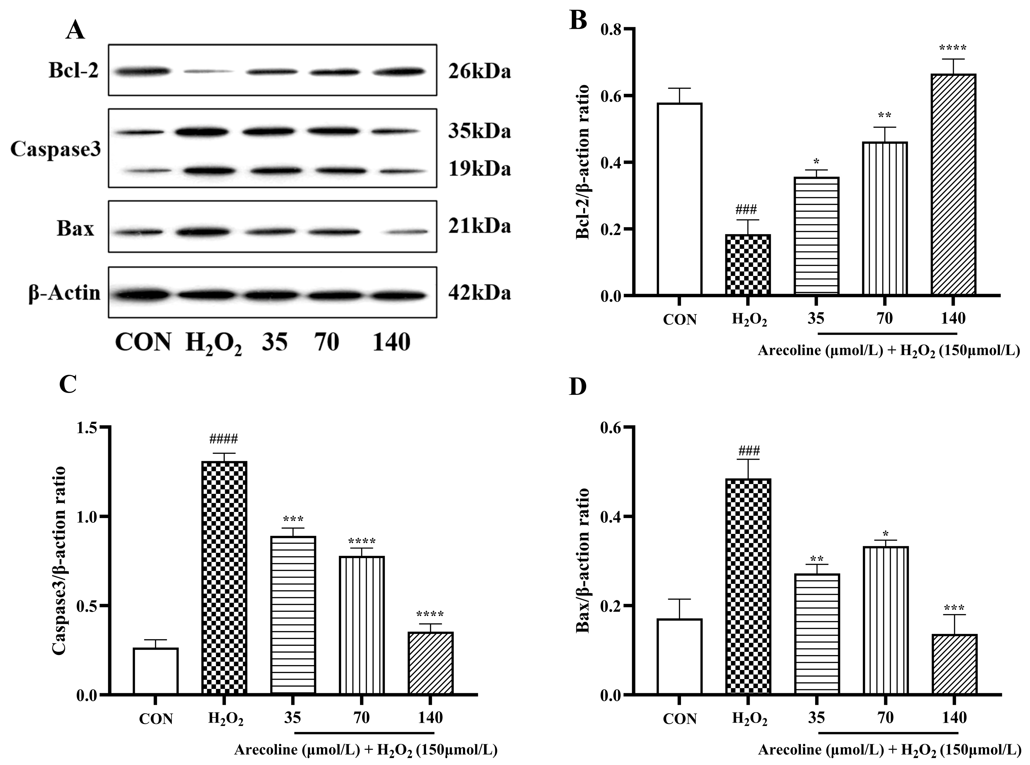 2.6. Effects of Arecoline on Bcl-2/Bax/Total Caspase-3 Signaling Pathways in H2O2-Induced SH-SY5Y Cells