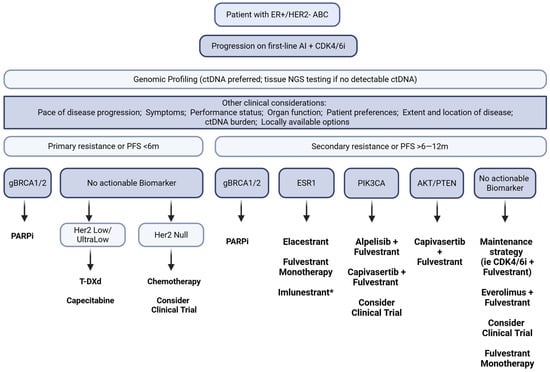 The three CDK4/6i available globally have demonstrated improvements in progression-free survival (PFS) when added to aromatase inhibitors and fulvestrant, with ribociclib also showing a significant improvement in overall survival (OS) in the registrational trials [8,9,10,11]. These efficacy data, combined with their tolerability profile and supportive quality of life data, have firmly established this first-line approach. However, optimal treatment after progression on a CDK4/6 inhibitor has not been standardized in the same way, with several treatment strategies being developed in parallel. Our understanding of the efficacy of post-CDK4/6i therapy comes from retrospective and real-world studies as well as an increasing number of prospective trials that have been completed and reported in this population [12,13,14]. Selecting optimal second and third-line therapies for patients with HR+/HER2− metastatic breast cancer requires careful consideration of disease characteristics (tumor biology, hormonal resistance, and presence or absence of predictive biomarkers) and patient characteristics (symptoms and disease burden, treatment toxicities, frailty, performance status, and patient preferences).