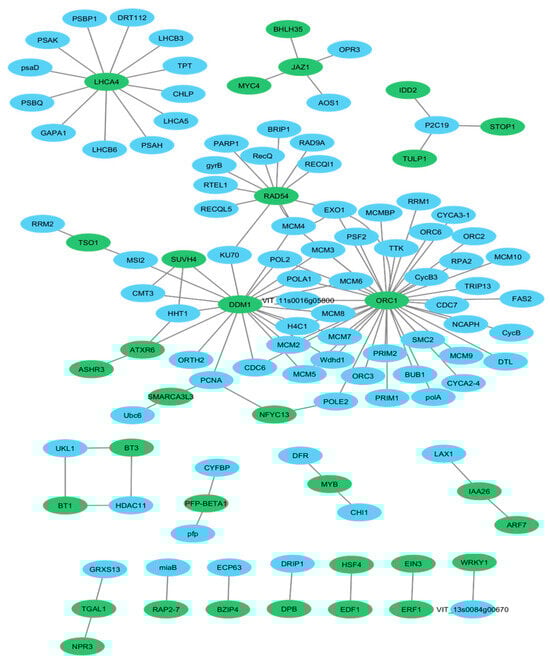 Among these DEGs, 33 (13 downregulated and 20 upregulated) (green nodes) were identified as putative key proteins in various TF families based on gene annotation and regulatory function prediction (Table S2). Most of these proteins could be transcription factors such as WRKY1, WRKY2, NPR3, JAZ1, BT1, BT3, HSF4, MYB, EIN3, DPB, EDF1, TSO1, STOP1, BZIP4, TGAL1, MYC4, BHLH35, ARF7, ERF1 and RAP2-7. Others involved in chromatin remodeling, such as SMARCA3L3, DDM1, SUVH4, ASHR3 and ATXR6, or in DNA repair such as RAD54 and ATXR6. Notably, several proteins (LHCA4, JAZ1, RAD54, DDM1, and ORC1) appeared as central hubs within the network, interacting with multiple proteins. This suggests their key regulatory roles in the blackcurrant’s low-temperature response and cold stress adaptation (Figure 1).
