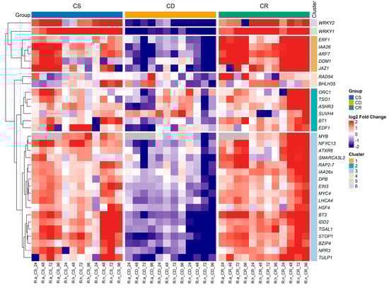 The heatmap revealed six hierarchical clusters, highlighting diverse transcriptional patterns and suggesting functional specialization among genes studied. The largest cluster contains 18 genes such as MYB, NFYC13, ATXR6, SMARCA3L3 and RAP2-7, reflecting a broad regulatory module that likely integrates multiple stress-responsive and hormonal signaling pathways. Members of this cluster, including MYB and RAP2-7, are known to regulate responses to abiotic stresses such as cold and oxidative stress, while ATXR6 and SMARCA3L3 suggest epigenetic regulation through chromatin remodeling. Together, these distinct clusters highlight the complexity of transcriptional reprogramming in blackcurrant during cold stress and acclimation, illustrating a finely coordinated yet functionally diverse network of transcription factors that underpins environmental adaptation. The second cluster, comprising ORC1, TSO1, ASHR3, SUVH4, BT1, and EDF1, is associated with chromatin remodeling and cell cycle regulation, suggesting roles in genome stability and stress-induced gene expression. Members of the third cluster ERF1, IAA26, ARF7, DDM1, and JAZ1 are collectively involved in hormone signaling and epigenetic regulation, critical for stress-responsive transcriptional reprogramming. The fourth cluster, containing RAD54 and BHLH35, points to functions in DNA repair and transcriptional regulation during cold stress, essential for maintaining genomic integrity and activating acclimation-related genes. The fifth and sixth clusters consist of WRKY1 and WRKY24, respectively, highlighting key roles of WRKY family TFs in cold stress signaling and defense regulation.