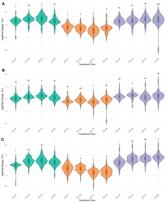 Violin plots depict the gene expression levels of Ribes species under different treatment stages: cold stress (CS), cold deacclimation (CD) or cold reacclimation (CR). (A) R. aureum, (B) R. hudsonianum, (C) R. nigrum. Different letters represent statistical reliability within a species (n ≥ 3).