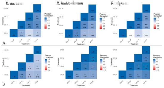 Expression consistency of TFs and acclimation-related genes across timepoints during CS—cold stress (A) and CR—cold reacclimation (B) hardening experiments in R. aureum, R. hudsonianum and R. nigrum (* p value = 0.05, ** p value <0.05, *** p value = 0.00).