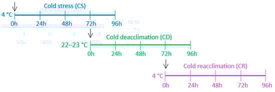 Experimental design containing cold stress (CS), cold deacclimation (CD), and cold reacclimation (CR) processes. Arrows indicate control points of the experiment at each stress stage.