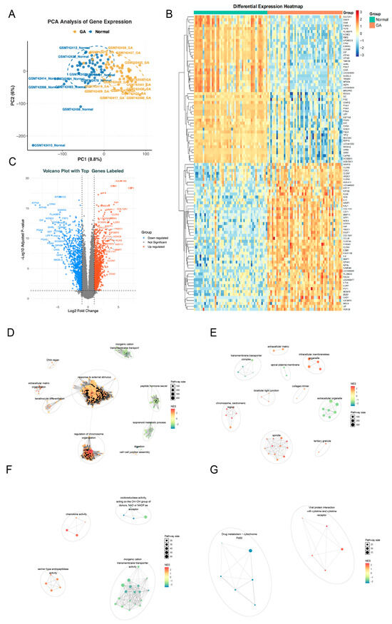 Principal components analysis (PCA) of the GSE29998 dataset revealed a distinct separation between GA and control samples (Figure 2A). Differential expression analysis identified 2043 differentially expressed genes (DEGs), including 904 downregulated genes and 1139 upregulated genes in GA samples (Figure 2B,C). Pathway enrichment analysis showed that Gene Ontology (GO) terms were mainly enriched in stress response, chromosome organization, extracellular structure, immune activity, and ion transport, while Kyoto Encyclopedia of Genes and Genomes (KEGG) pathways highlighted drug metabolism (cytochrome P450) and viral protein–cytokine interactions, indicating coordinated regulation of cellular response, immunity, and metabolism (Figure 2D–G).