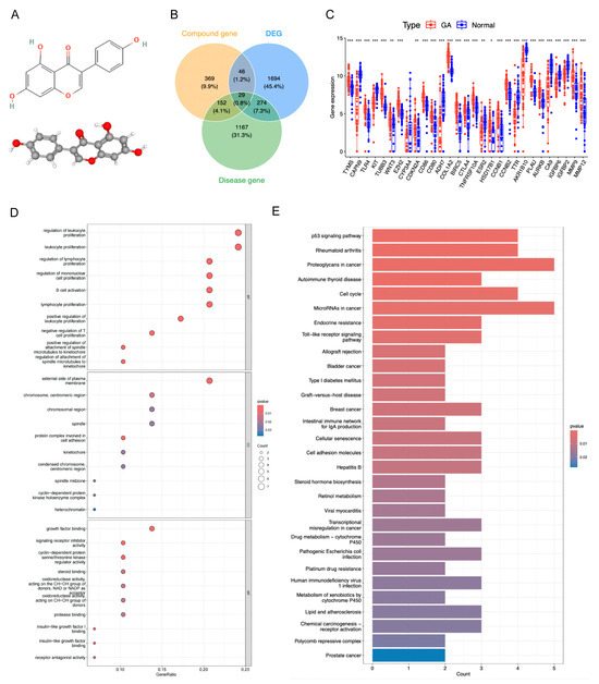 Acquisition and functional analysis of candidate genes. (A) The molecular structure of genistein. (B) Venn diagram of drug target genes, GA target genes, and DEGs to identify candidate genes. (C) Expression box plot of candidate genes in GSE29998 dataset. * p < 0.05, ** p < 0.01, *** p < 0.001. (D) GO terms enriched by candidate genes. (E) KEGG pathways enriched by candidate genes.