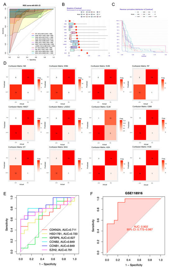 Among the machine learning models developed using candidate genes, the NB model showed superior performance, with the highest area under the curve (AUC) value (AUC = 1), minimal residual error, and greatest classification accuracy as indicated by the confusion matrix (Figure 4A–D, Table S2). Therefore, the Naive Bayes (NB) model was selected as the optimal predictive model, with 6 genes within the model identified as candidate key genes (HSD17B1, EZH2, CCNB1, CCNB2, CDKN2A, and IGFBP6). These candidate genes demonstrated high diagnostic accuracy for GA, with AUC values above 0.6 for each individual gene. A predictive model constructed from these genes in the GSE118916 dataset yielded an AUC greater than 0.9 (Figure 4E,F). Kaplan–Meier survival analysis revealed significant differences in survival outcomes among the expression groups of all candidate key genes (Figure S3).