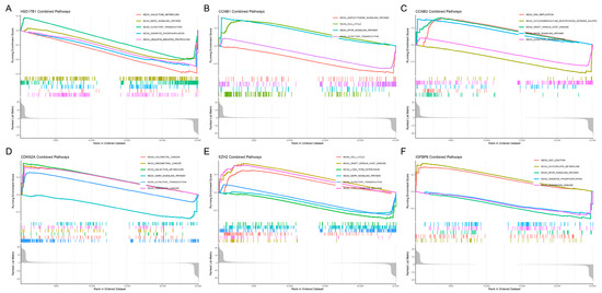 Gene set enrichment analysis (GSEA) of candidate key genes. (A) HSD17B1, (B) CCNB1, (C) CCNB2, (D) CDKN2A, (E) EZH2, (F) IGFBP6.