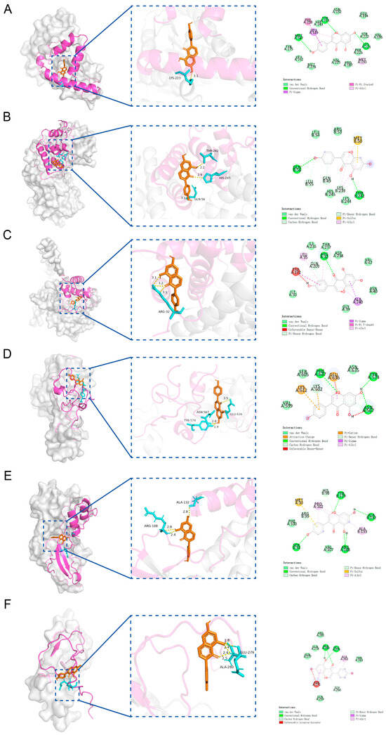 Molecular docking of 6 candidate key genes and genistein. (A) Molecular docking between HSD17B1 and genistein. (B) Molecular docking between CCNB1 and genistein. (C) Molecular docking between CCNB2 and genistein. (D) Molecular docking between EZH2 and genistein. (E) Molecular docking between CDKN2A and genistein. (F) Molecular docking between IGFBP6 and genistein.