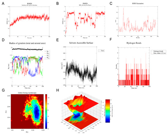 MD simulations were performed in GROMACS 2020 using the docked complexes of the key gene and genistein [72]. The protein was constructed using the CHARMM36 force field, and ligand parameters were generated with the Sobtop tool based on the GAFF force field. Atomic types, bond angle parameters, and charge distributions were checked to confirm compatibility with GROMACS. In the simulation, the TIP3P water model was used, and Na+/Cl− ions were added to neutralize charges and simulate physiological conditions. Simulations were carried out in an NPT ensemble with a 2-fs time step, applying LINCS hydrogen bond constraints, Particle Mesh Ewald (PME) electrostatics (1.2 nm cutoff), a 1.0 nm van der Waals cutoff, and neighbor list updates every 10 steps. Temperature (300 K) and pressure (1 bar) were controlled using the V-rescale thermostat and Berendsen barostat. The system underwent energy minimization using the steepest descent, with convergence achieved when the maximum atomic force fell below 1000 kJ/mol/nm. This was followed by stepwise equilibration: 100 ps in the NVT ensemble and 100 ps in the NPT ensemble at 300 K. During both the NVT and NPT equilibration stages, convergence was determined by monitoring the system’s energy, temperature, and pressure. The equilibration was considered complete and transitioned to the next stage only when the curves of these parameters stabilized, showing no systematic drift and remaining within a narrow random fluctuation range. Production simulations were performed for 100 ns (NPT), with trajectory snapshots saved every 10 ps. Trajectory analysis was conducted using VMD 1.9.4 and PyMOL 3.1, and structural evolution was assessed through root mean square deviation (RMSD), radius of gyration (Rg), root mean square fluctuation (RMSF), buried solvent accessible surface area (SASA), and hydrogen bond dynamics.